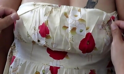 Wife dressed as schoolgirl frolicking with big tits and pussy